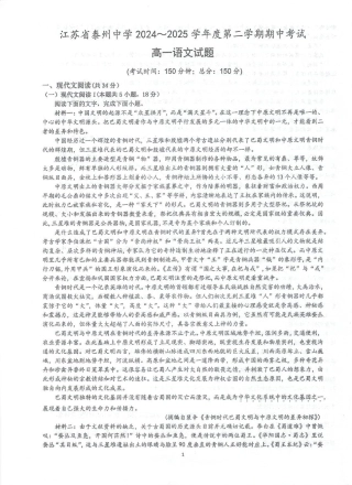 江苏省泰州市海陵区泰州中学2024-2025学年高一下学期4月期中考试语文试题(PDF版,含答案).pdf